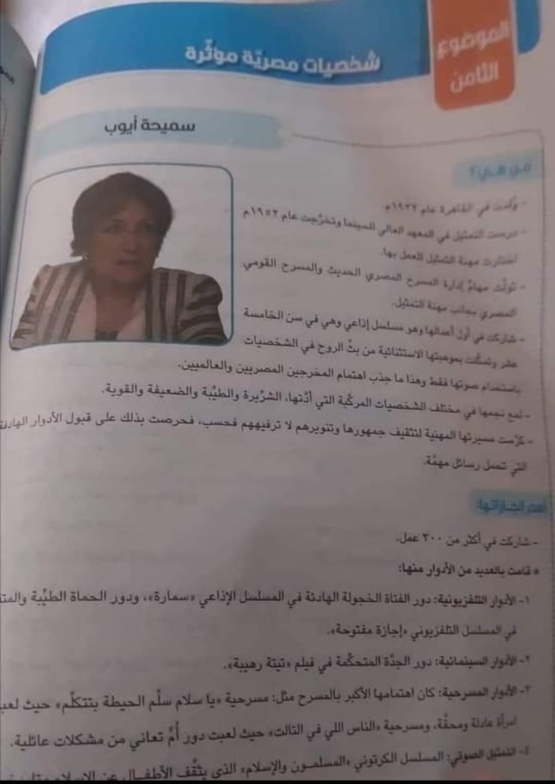 ووضع مؤلفو المنهاج صورة للفنانة سمحية أيوب ضمن درس يحكي عن شخصيات مؤثرة بالمجتمع ، مما أثار ردود أفعال مختلفة خلال الساعات الماضية، على وسائل التواصل الاجتماعي.