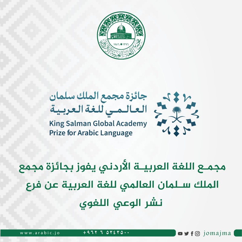 فاز مجمع اللغة العربية الأردني بجائزة مجمع الملك سلمان العالمي للغة العربية، وأعلن المجمع في بيان صحفي فوزه بالجائزة عن فرع نشر الوعي اللغوي.