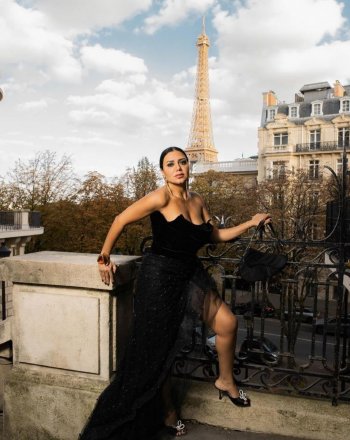 ظهرت النجمة المصرية رانيا يوسف مرتدية فستاناً أسوداً عبارة عن كورسيه ضيق على الجسم مع تول كبير وطويل وفيه فتحة طويلة تظهر الساقين خصوصًا ان البطانة مفتوحة ايضاً.