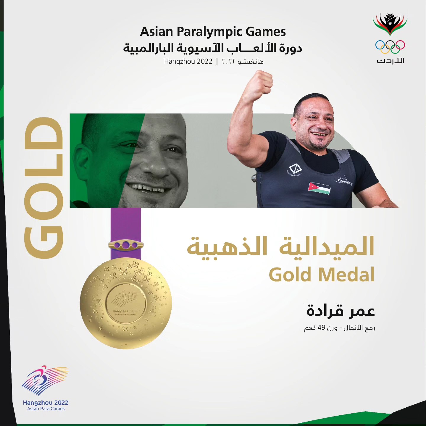 تمكن لاعب المنتخب الوطني لرفع الأثقال البارالمبي، عمر قرادة، من احراز الميدالية الذهبية، لمنافسات وزن 49 كغم، بدورة الألعاب الآسيوية البارالمبية (هانغتشو 2022) التي انطلقت الأحد.
