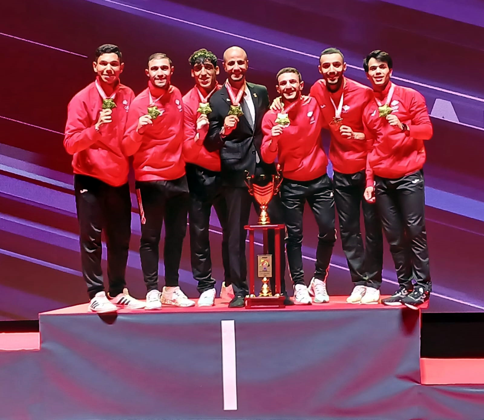وجاء فوز المنتخب الوطني للرجال والمكون من محمد الجعفري وعفيف غيث وحسن مصاروة وأحمد شديد وعبدالله حماد ويوسف نوفل وتحت قيادة المدير الفني محمد ابراهيم والمدرب محمد فتيان بالميدالية الذهبية بعد فوزه في النهائي على حساب المنتخب المصري بمجموع النقاط بعد التعادل، وتعتبر هذه هي ثاني ميدالية يُحققها منتخبنا الوطني في هذه النسخة من بطولة العالم حيث توج السّبت اللاعب محمد الجعفري بالميدالية البرونزية في منافسات وزن تحت ٨٦ كغم وأصبح أول لاعب أردني يُتوج بميدالية في بطولات العالم للكراتيه والتي انطلقت للمرة الأولى عام ١٩٧٠.
