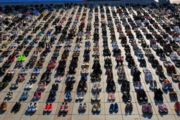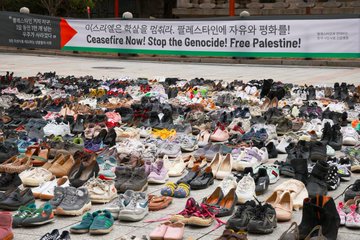 تم وضع نحو 2,000 زوج من الأحذية في قلب عاصمة كوريا الجنوبية، سيئول، اليوم الجمعة حدادا على من قتلوا خلال الحرب الإسرائيلية في قطاع غزة.