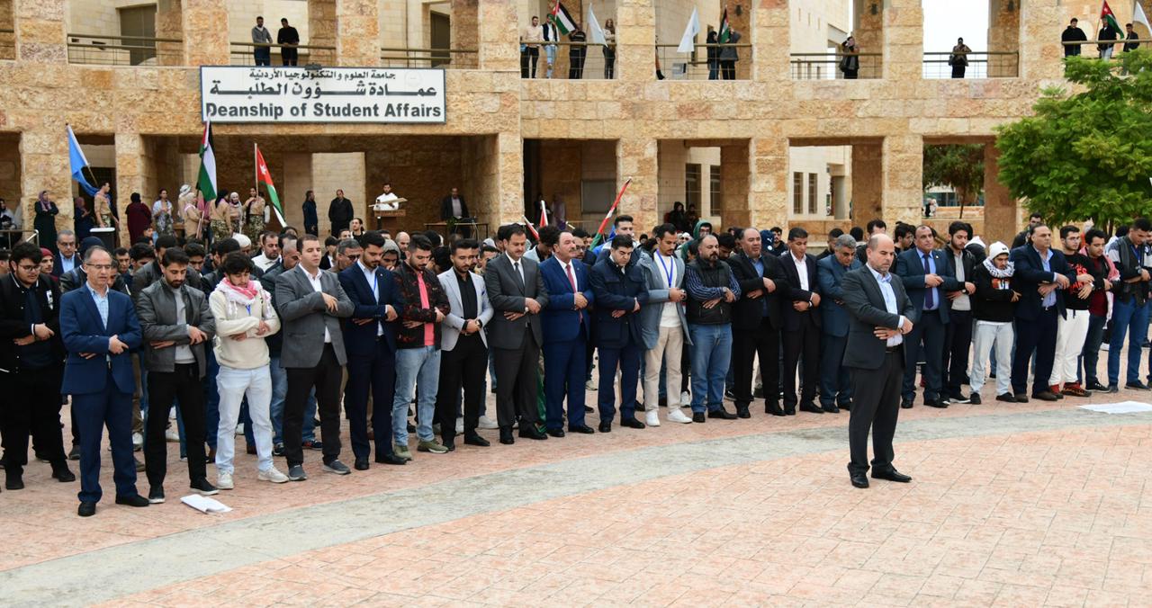 وأكد السالم على أهمية هذه الوقفة التضامنية لتعزيز الروابط الإنسانية والتعبير عن الدعم المستمر لأهلنا في غزة، مشيرًا إلى أن هذه الخطوة تعكس الروح الإنسانية الراسخة في قلوب أفراد المجتمع الجامعي وحرصهم على الوقوف صفًا واحدًا مع الشعب الفلسطيني الشقيق في مواجهة الظلم والاعتداءات التي يتعرض لها، ومع قيادنا الهاشمية الحكيمة في دعم القضية الفلسطينية لتحقيق السلام والاستقرار.