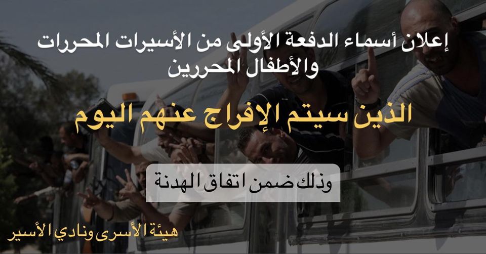 أعلنت هيئة الأسرى والمحررين ونادي الأسير الفلسطيني، أسماء الدفعة الأولى من الأسيرات المحررات والأطفال المحررين الذين سيتم الإفراج عنهم اليوم من قبل الاحتلال، ضمن اتفاق الهدنة.
