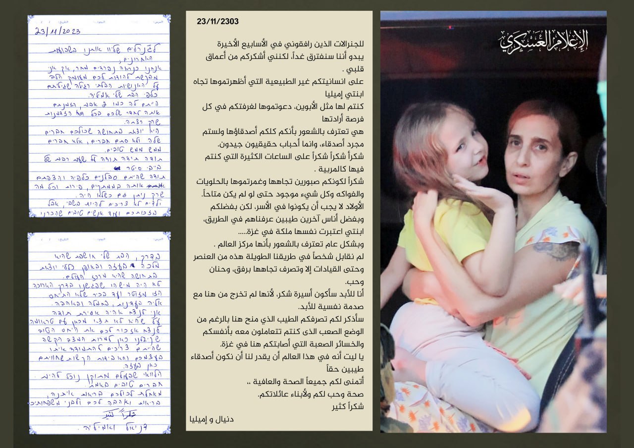 المراقبُ لعمليّة الإفراج سينتبه لعدّة أمور، ولعلَّ أبرزها هو ما ينقله أسرى الاحتلال المفرج عنهم من سجون المقاومة الفلسطينيّة، فلم نجد لغاية الآن، أسيرًا واحدًا فقط تحدّث عن سوءِ معاملة، أو إهانة، أو تعذيب، بل رأينا مشاهد بدَت صادمة للعلاقة بينَ السّجين والسّجان، رأينا تلويح الأسرى لعناصِر القسام، ورأينا وداعهم لهم، ورأيناهم يحملونَ في أيديهم ما يأكلون، ورأيناهم بصحة جيّدة، ولباس جيّد، وأكثر من ذلك.. رأينا اليوم رسالة الأسيرة وابنتها "دانيال وإيميليا" التي تركتها بخطِّ يدها للمقاومين.. والتي قالت فيها: "ليتَ العالم يقدّر أن نكونَ أصدقاء". هذه الأمنية البسيطة التي ختمت بها رسالتها حولَ حسن التعامل معها ومع ابنتها.