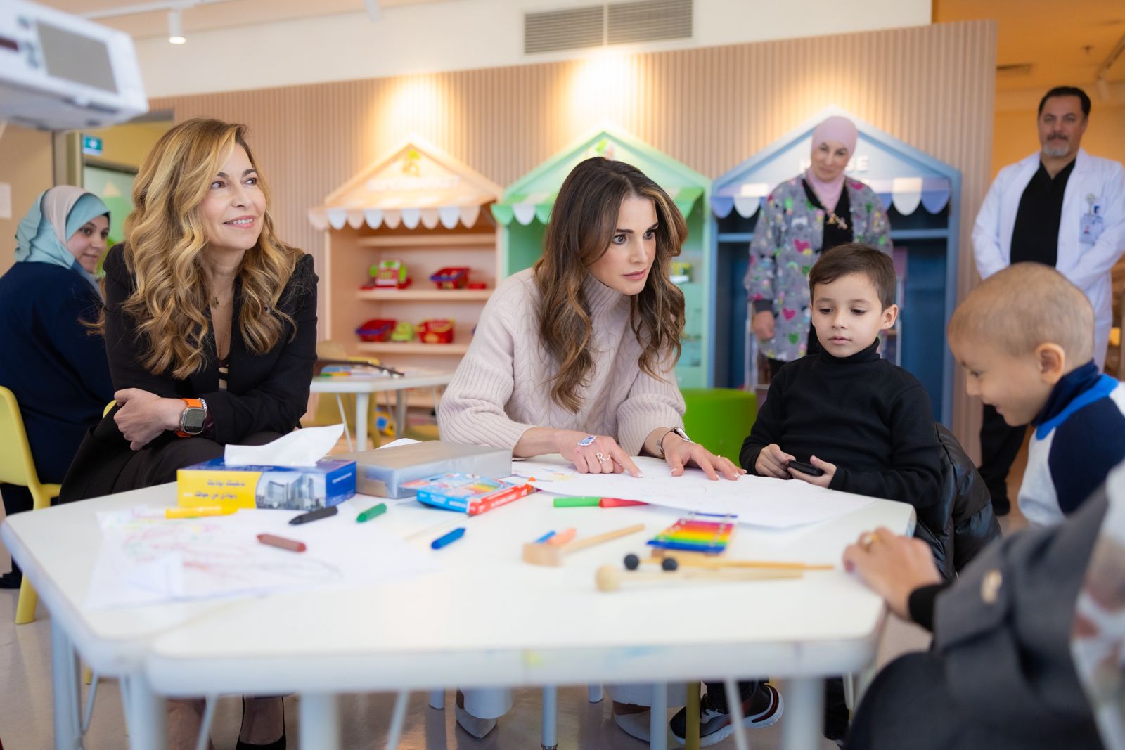 واطمأنّت جلالة الملكة رانيا، بحضور سمو الأميرة غيداء طلال، رئيسة هيئة أمناء مؤسسة ومركز الحسين للسرطان، ومدير عام مركز الحسين للسرطان الدكتور عاصم منصور، ومدير عام مؤسسة الحسين للسرطان نسرين قطامش، على صحة المرضى الأطفال من غزّة واستفسرت عن وضع وسلامة أهلهم، واستمعت من الكادر الطبي عن حالتهم الصحية والنفسية، وعما يقدم لهم من عناية وعلاج.
