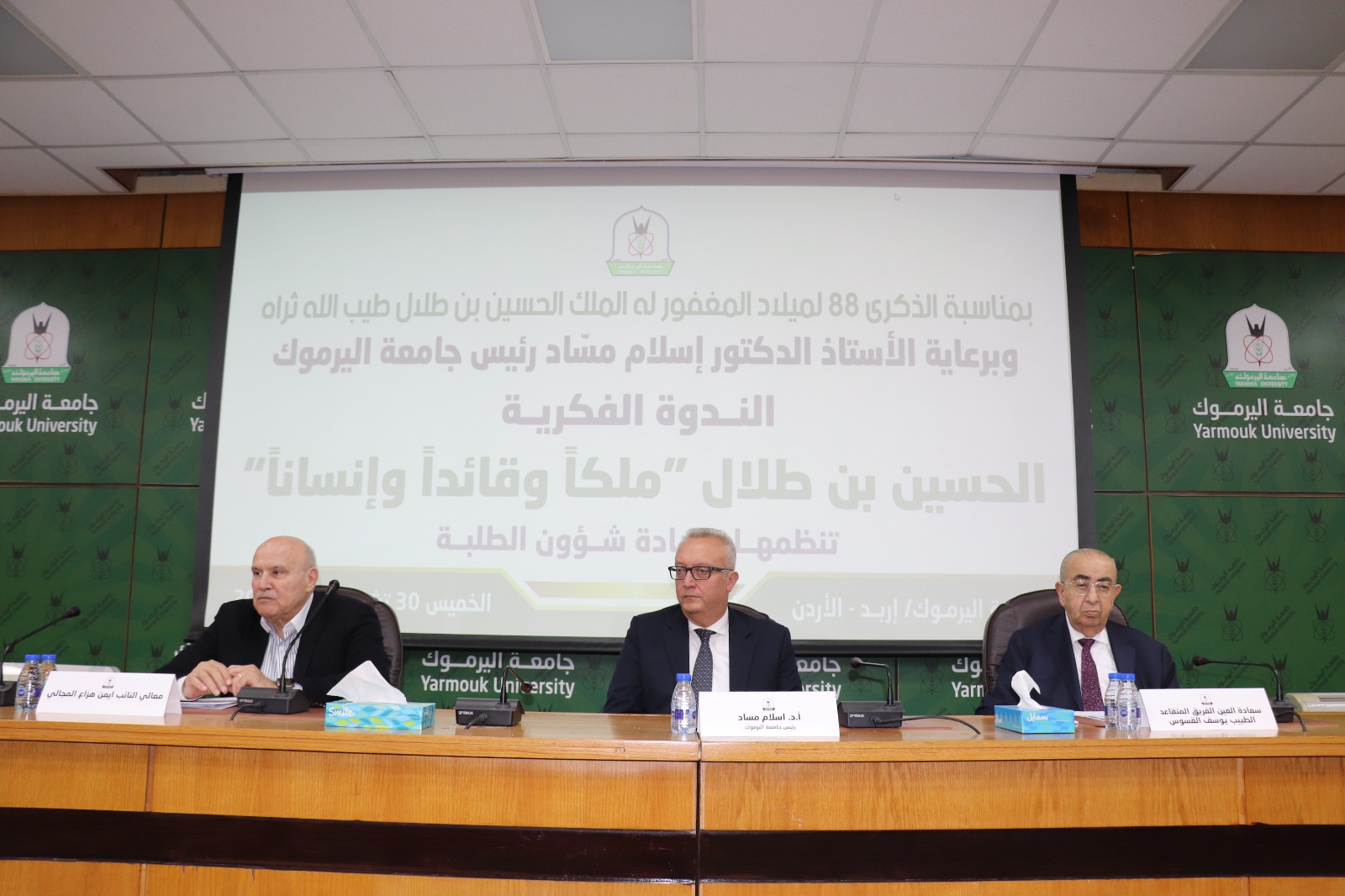 استذكرت جامعة اليرموك جلالة الملك الباني الحسين بن طلال- طيب الله ثراه-، بندوة فكرية حملت عنوان (الحسين بن طلال "ملكا وقائدا وإنسانا") بمناسبة الذكرى الـ 88 لميلاد جلالته، رعاها رئيس الجامعة الدكتور إسلام مسّاد، ونظمتها عمادة شؤون الطلبة في القاعة الرئيسية لمبنى المؤتمرات والندوات، وسط حضور وتفاعل طلابي واسع من مختلف كليات الجامعة.