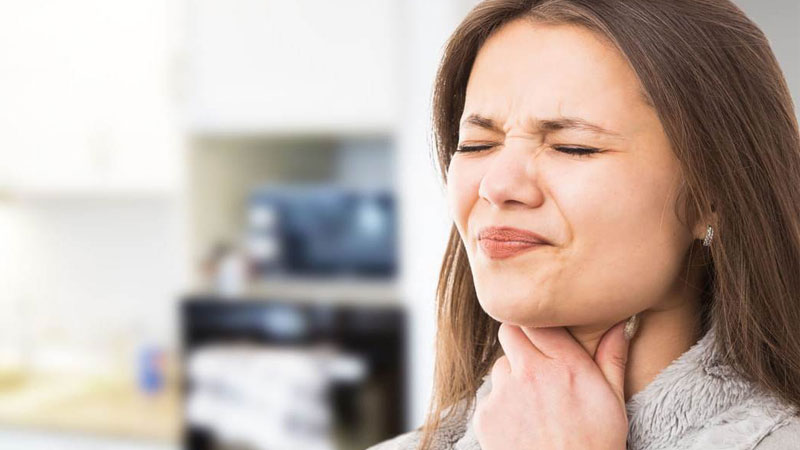 التعرّض للمهيجات الكيميائية: حيث إنّ التعرّض للجسميات الناجمة عن حرق الوقود، والمواد الكيميائية المنزلية الشائعة يؤدي إلى تهيج الحلق.