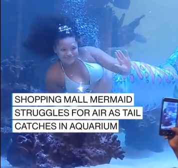 نجت امرأة تعمل حورية بحر، من الموت غرقًا داخل حوض عملاق في أحد المراكز التجارية، بعدما علق "ذيلها" أثناء الغوص.