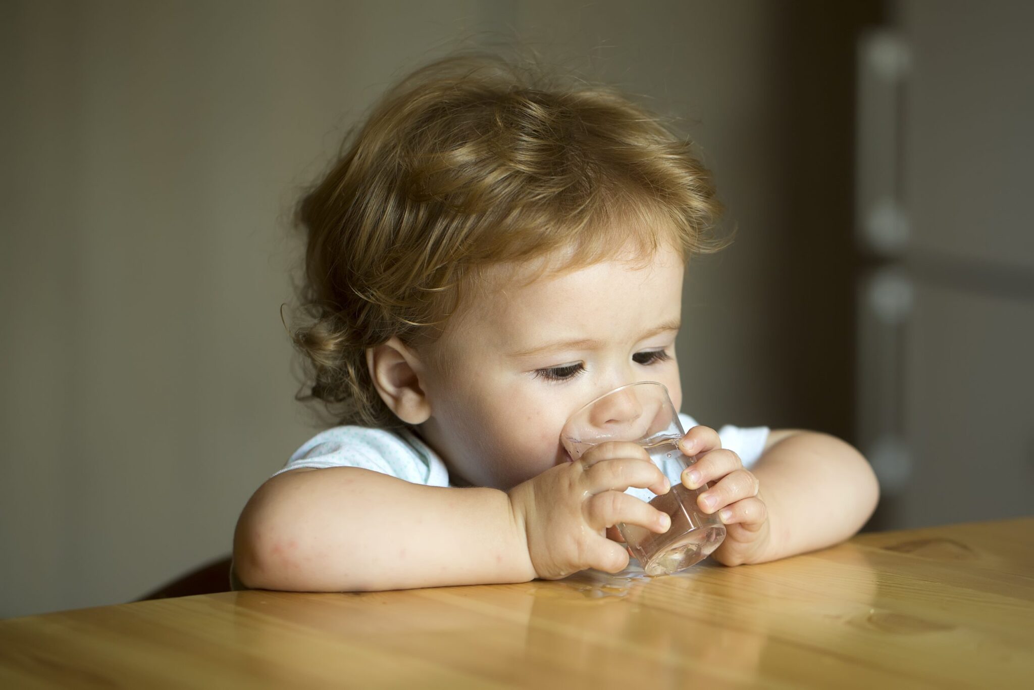 العطش الشديد والمستمر لدى الطفل، وكثرة الإقبال على شرب الماء، وكذلك تظهر على جسمه علامات جفاف وخاصة في منطقة الشفتين والوجه، ويؤدي الجفاف الشديد إلى تقشر جلد الجسم.