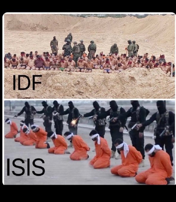 وكتب أحدهم معلقا: "داعش جيش إسرائيل"، وأضاف آخر: "الصورة الأولى لتنظيم داعش خلال عملية اعدام ميدانية بالعراق عام 2015.. بعدها تم تكوين تحالف دولي رسمي مكون من 86 دولة للقضاء عليه..الصورة الثانية للكيان الصهيوني وهو يقتدي مجموعة من المدنيين منذ قليل إلى منطقة خالية تمهيدا لإعدامهم .. ولا توجد دولة واحدة تستطيع المساس بهذا الكيان أو إطلاق رصاصة واحدة عليه. نحن نعيش في أرذل الحقب التاريخية!"