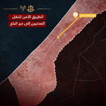إلى سكان شمال القطاع، نحثكم على إخلاء أماكن تواجدكم بشكل عاجل والتوجه من خلال طريق صلاح الدين نحو المآوي المعروفة في منطقة دير البلح بين الساعة العاشرة 10:00 صباحا وحتى الساعة الرابعة 16:00 مساء.