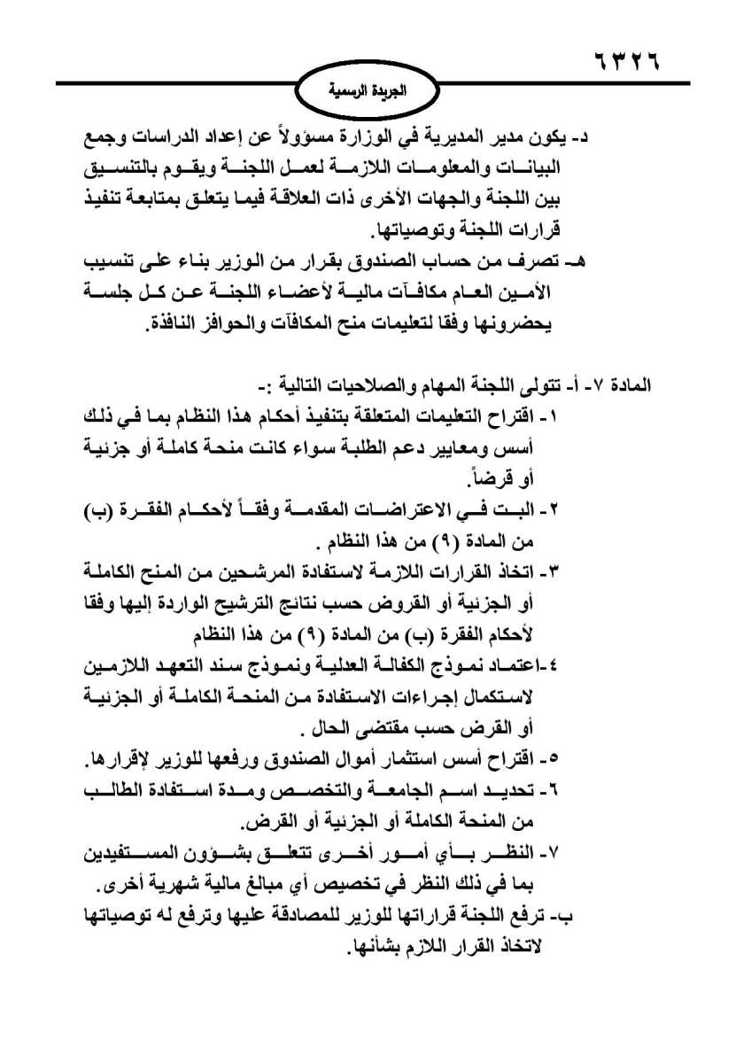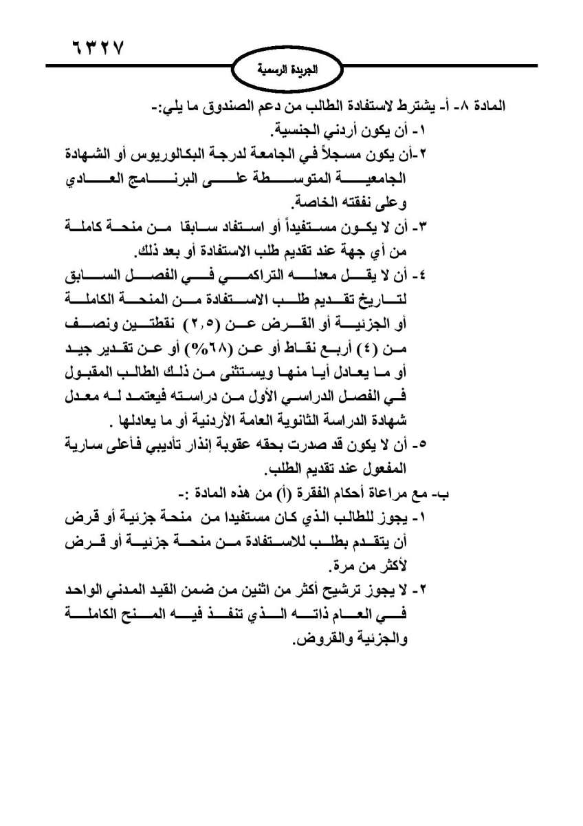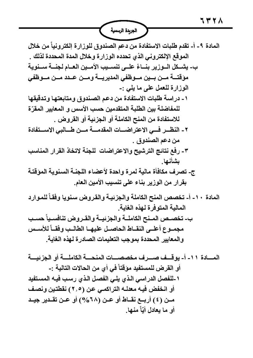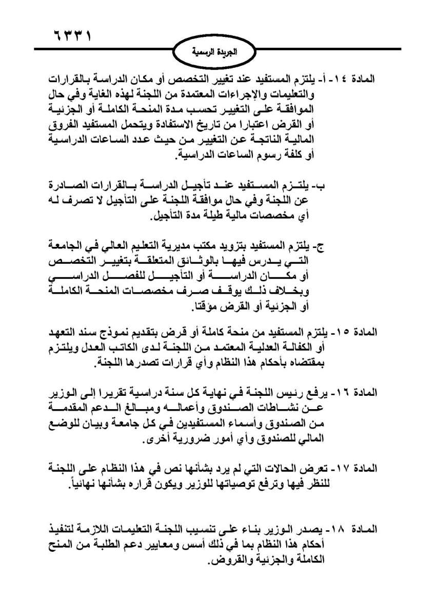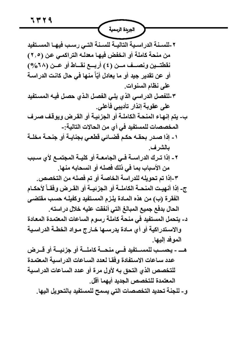 وبحسب النظام الجديد، فقد اشترط أن لا يقل معدل الطالب التراكمي في الفصل السابق لتاريخ تقديم طلب الاستفادة من المنحة أو القرض 2.5 من 4 نقاط أو عن 68 بالمئة أو عن تقدير جيد، في حين كان في السابق لا يقل معدل الطالب التراكمي عن 60 بالمئة أو عن نقطتين من أصل 4 نقاط.