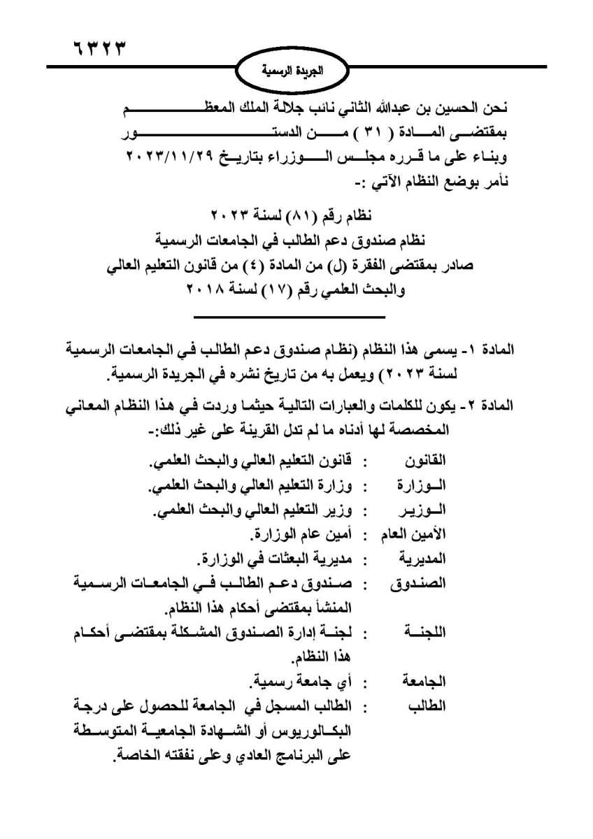 صدر في الجريدة الرسمية، نظام صندوق دعم الطالب الجامعي لسنة ٢٠٢٣ بعدما كانت الحكومة أجرت تعديلات عليه تضمنت تعديل شروط الاستفادة من الصندوق.