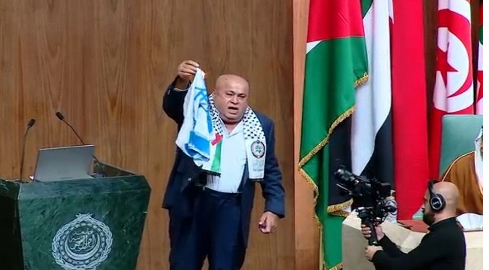 خليل عطية يحرق علم إسرائيل في الجامعة العربية .. فيديو