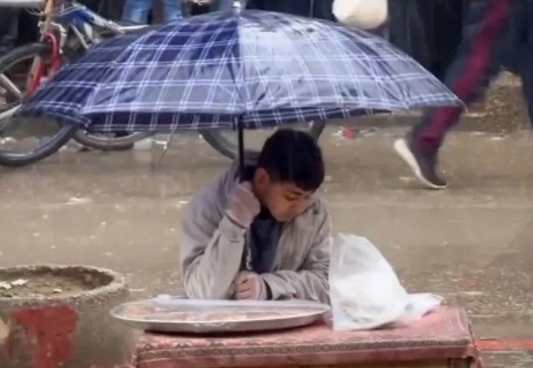 وأظهر الفيديو الذي لاقى انتشاراً واسعاً خلال الساعات الماضية، جلوس الطفل على أحد أرصفة الشوارع، وأمامه طاولة يضع عليها بعض أنواع الطعام الذي يأمل في بيعه من أجل توفير قوت يومه لإعالة أسرته، ممسكاً َمظلة بإحدى يديه لتخفيف حدة الأمطار المنهمرة فوق رأسه، وبيده الآخرى يواصل البيع، مبدياً بذلك إصراراً كبيراً على عدم الاستسلام رغم تأثير البرد القارس عليه، كما يظهر الفيديو.