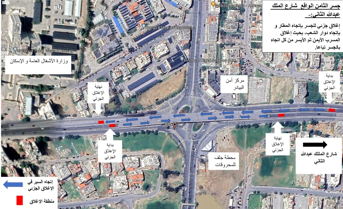 وقالت الوزارة في بيان، إنه سيجري بالتعاون مع مديرية الأمن العام إغلاق السير جزئياً على أحد مسارب الجسر ولحين إتمام أعمال الصيانة ومن ثم الانتقال إلى المسرب الآخر بنفس آلية العمل وحسب المخطط المرفق اعتبارا من فجر يوم الجمعة وحتى مساء ذات اليوم.