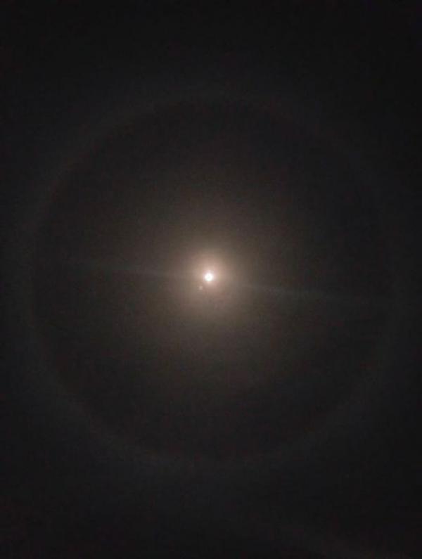 وتابعت الدائرة: "عندما يمرّ الضوء عبر بلورات الجليد سداسية الشكل فإنّه ينحرف بزاوية تبلغ 22 درجة، ممّا ينتج عنه هالة بنصف قطر مقداره 22 درجة، ويمكن ان تكون الهالة باهتة جدا او مميزة جدا بناء على كمية الغيوم الرقيقة و/ او كمية الضوء التي تمر من خلالها".