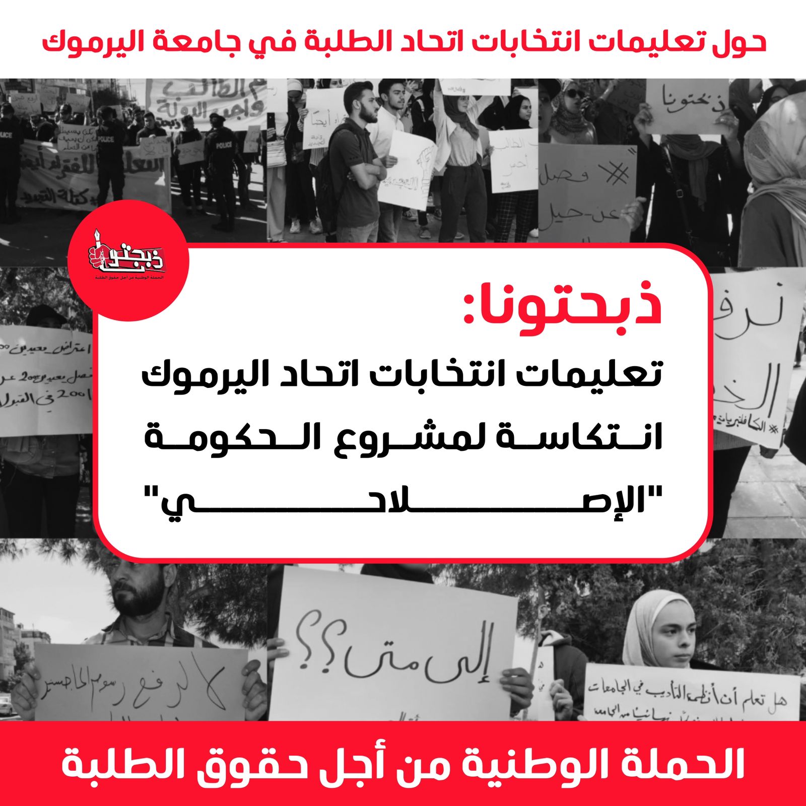 إننا في الحملة الوطنية من أجل حقوق الطلبة "ذبحتونا" نطالب إدارة جامعة اليرموك بسحب هذه التعليمات وفتح حوار مع القوى الطلابية الفاعلى في الجامعة، والاستماع لآراء المختصين في مجال العملية الانتخابية، وإعادة النظر بكافة النقاط والملحاظات التي قمنا بطرحها.