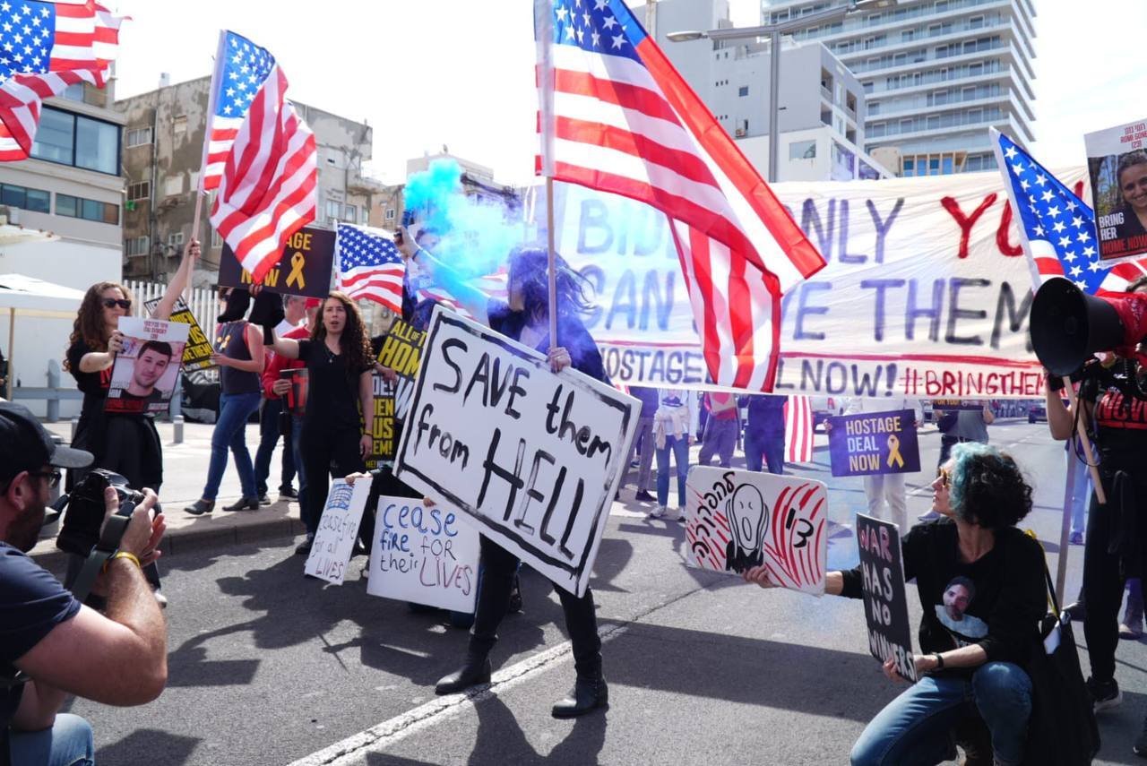 نظمت عائلات الأسرى الإسرائيليين لدى "حماس" مظاهرة في تل أبيب أمام مكتب فرعي تابع للسفارة الأمريكية، حيث أغلق المشاركون فيها الطريق المودية للمكتب المذكور.