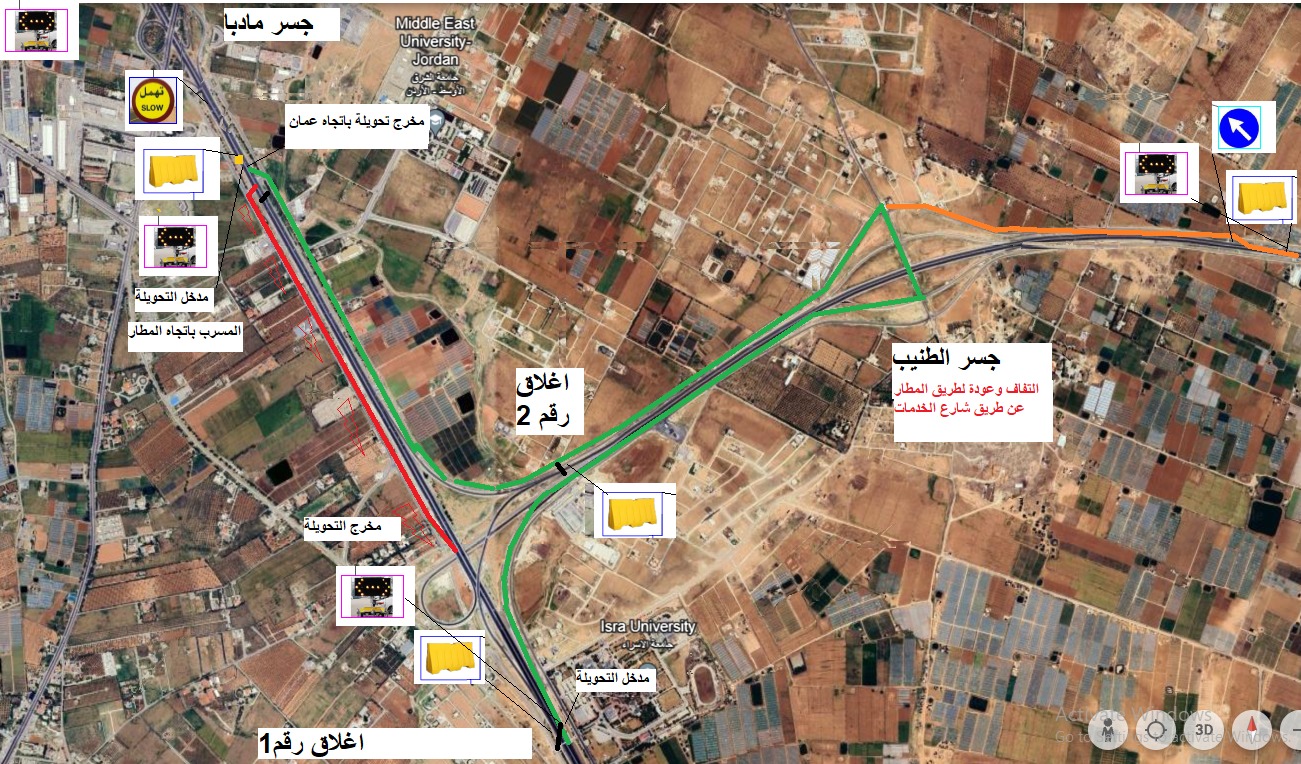 اغلاق (رقم 2) سيتم تحويل السير القادم من ممر عمان التنموي(شارع ال ١٠٠) إلى مسرب الخدمة قبل جسر الطنيب بإتجاه عمان والعودة إلى شارع المطار عبر أول مخرج لشارع الخدمات بعد موقع الجسر المراد تركيبه، و يبقى السير المتجه الى طريق مطار الملكة علياء و محافظات الجنوب كما هو.