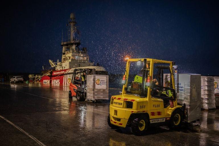 وأُنشئ رصيف ميناء موقت لتفريغ الحمولة في غزة.
