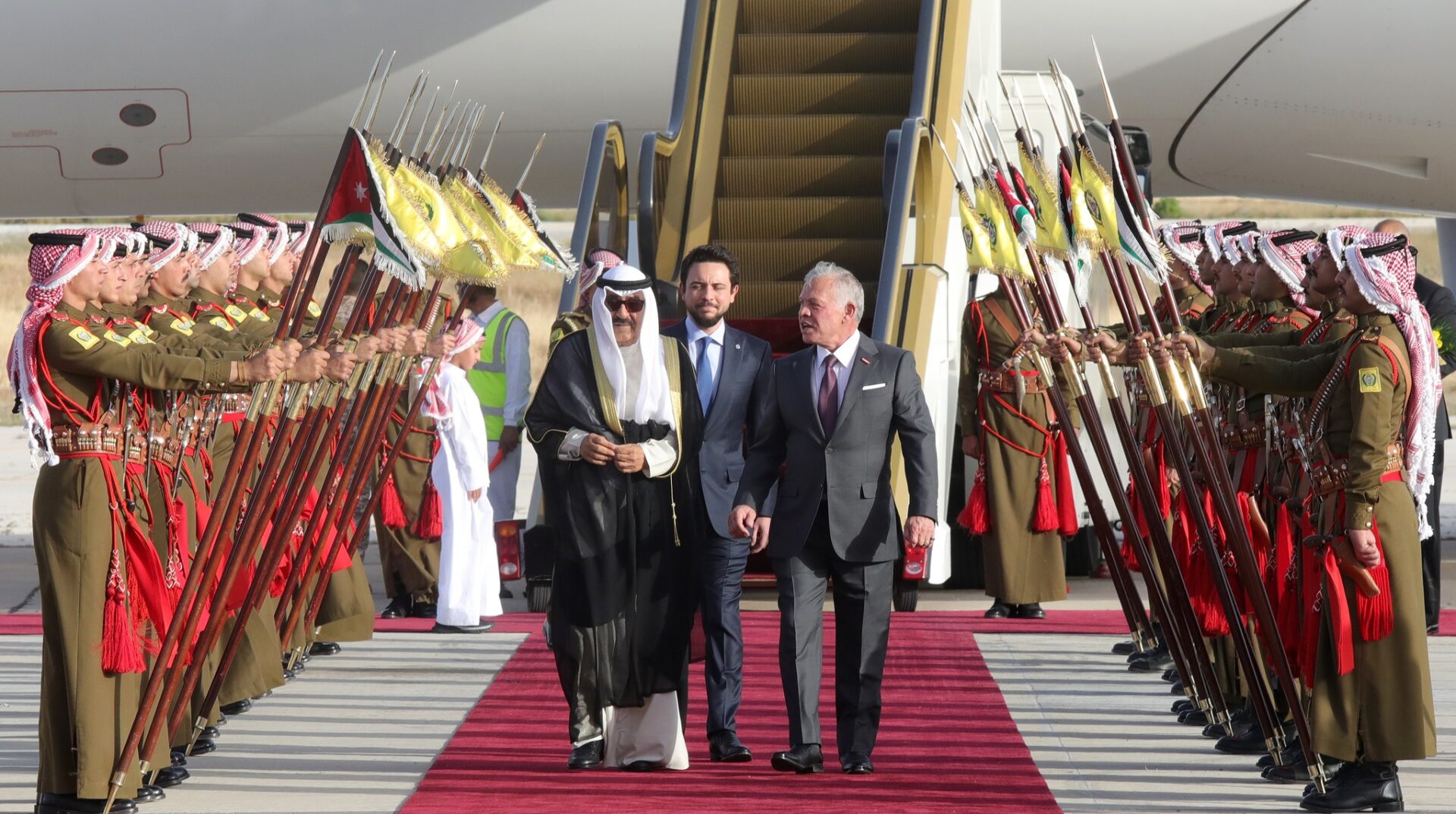 ولدى وصول موكب سمو أمير دولة الكويت إلى الديوان الملكي الهاشمي محاطا بالموكب الأحمر، المخصص للمناسبات الرسمية والاحتفالات الوطنية، رافق مجموعة من فرسان الحرس الملكي (الخيالة) الموكب، ترحيبا بضيف الأردن الكبير.