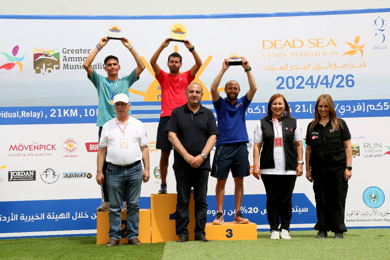 ومندوبًا عن راعي الألتراماراثون سمو الأمير فراس بن رعد رئيس مجلس إدارة الجمعية، توّج أمين عمان الدكتور يوسف الشواربة ومديرة الجمعية لينا الكرد ورئيس الاتحاد الأردني الدكتور وليد الرحاحلة وعضو مجلس إدارة الجمعية ريم بدران، الفائزين في مختلف فئات السباق، حيث أتت نتائج السباق كالتالي: