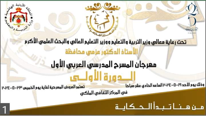 تقيم وزارة التربية والتعليم إدارة النشاطات التربوية قسم المسرح، تحت رعاية معالي الوزير الاستاذ الدكتور عزمي محافظة، مهرجان المسرح المدرسي العربي الاول وذلك خلال الفترة مابين ١٩- ٢٠٢٤/٥/٢٣ على مسارح المركز الثقافي الملكي .