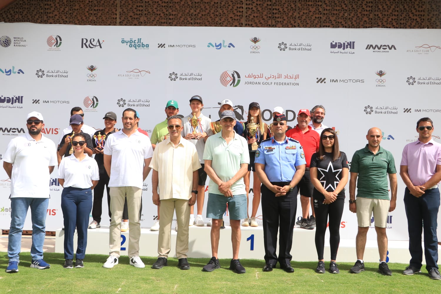 وسلّم راعي حفل التتويج رئيس سلطة منطقة العقبة الاقتصادية الخاصة نايف الفايز، جوائز البطولة للفائزين، بحضور رئيس الاتحاد الأردني للجولف كريم البرغوثي، ونائب رئيس الاتحاد ناصر الشوملي، والأمين العام للاتحاد الرياضي في مديرية الأمن العام العقيد ينال الجازي، و رئيس مجلس إدارة شركة واحة أيلة للتطوير خالد المصري.