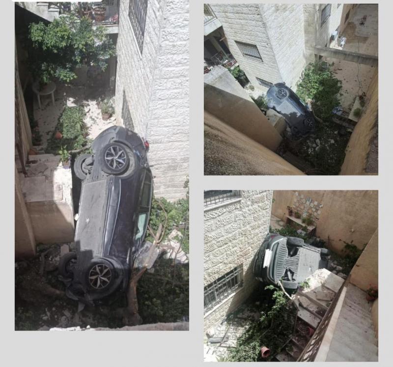 وأظهرت الصورة وقوع مركبة في فناء أحد المباني من على ارتفاع عدة طوابق، حيث أرجعت إدارة السير السبب إلى الرجوع بالمركبة بشكل خاطئ من قبل السائق.