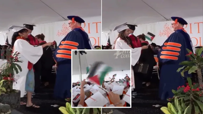 قام خريجو جامعة بيتزر الأمريكية بتسليم الأعلام الفلسطينية إلى رئيس مجلس الكلية ستروم ثاكر، ستروم ثاكر، الذي رفض مقاطعة إسرائيل وسحب الاستثمارات منها، خلال حفل التخرج.