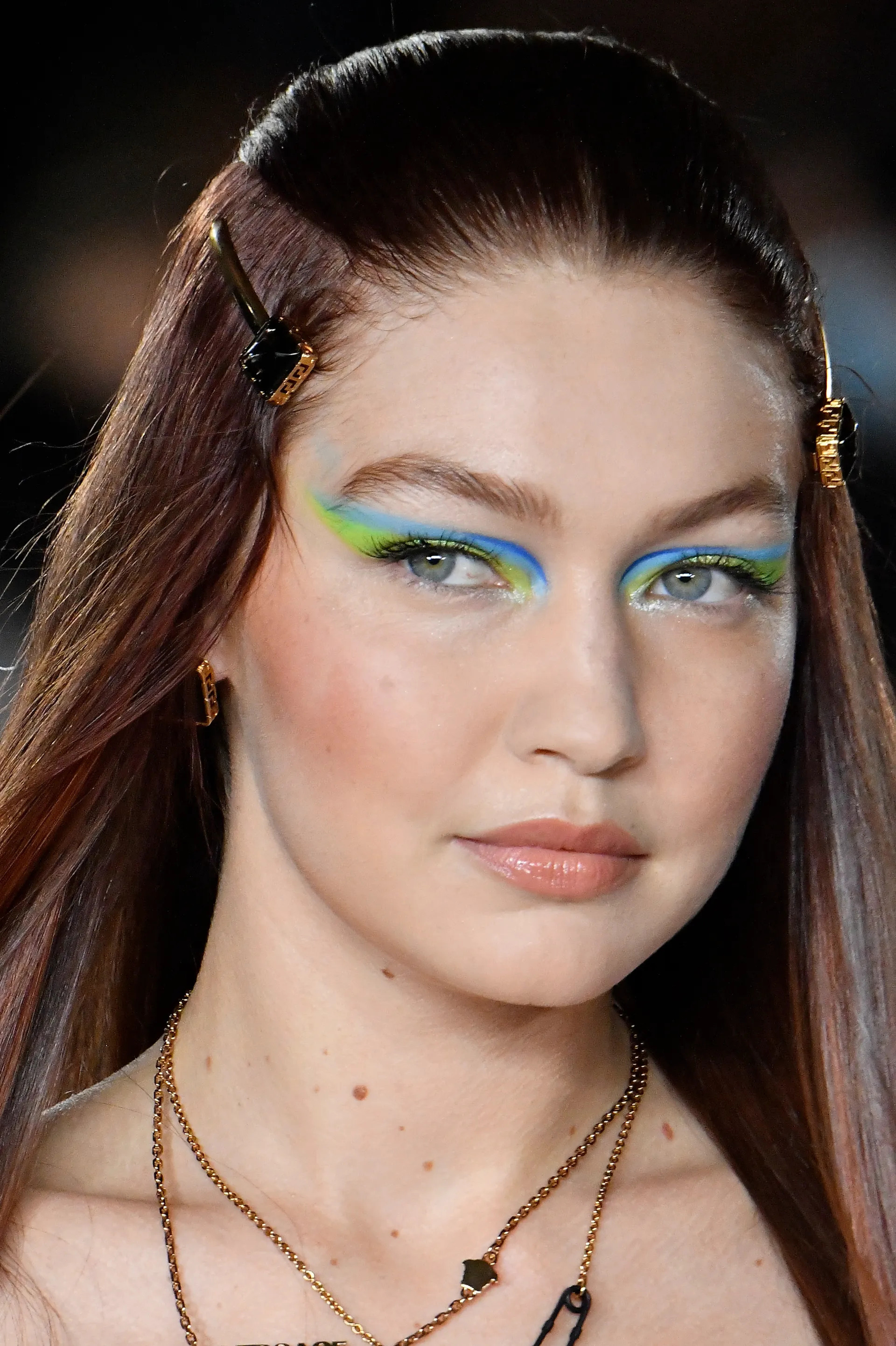 خلال مرورها على منصة عرض دار Versace لخريف وشتاء 2023، تألقت حديد بمكياج خارج عن المألوف. بشرة نضرة ذات اللون الموحد مع آيلاينر عريض جداً ومجنح بطريقة مبالغ فيها، وأحمر شفاه بدرجة من النود اللامع، هكذا خطفت حديد الأنظار.