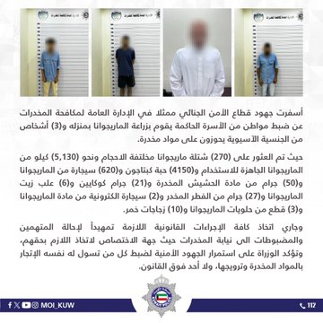 وقالت وزارة الداخلية في بيان: "تم العثور على 270 شتلة ماريغوانا مختلفة الأحجام ونحو 5.130 كيلو من الماريجوانا الجاهزة للاستخدام و4150 حبة كبتاغون و620 سيجارة من الماريغوانا و50 غراما من مادة الحشيش المخدرة و21 غرام كوكايين و6 علب زيت الماريغوانا و27 غراما من الفطر المخدر و2 سيجارة الكترونية من مادة الماريغوانا و3 قطع من حلويات الماريغوانا و10 زجاجات خمر".