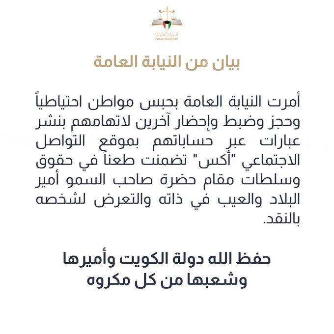 وأعلنت النيابة العامة الكويتية مساء السبت أنها أمرت بحبس مواطن احتياطيا، وحجز وضبط وإحضار آخرين بتهمة نشر عبارات تطعن في حقوق وسلطات أمير البلاد.