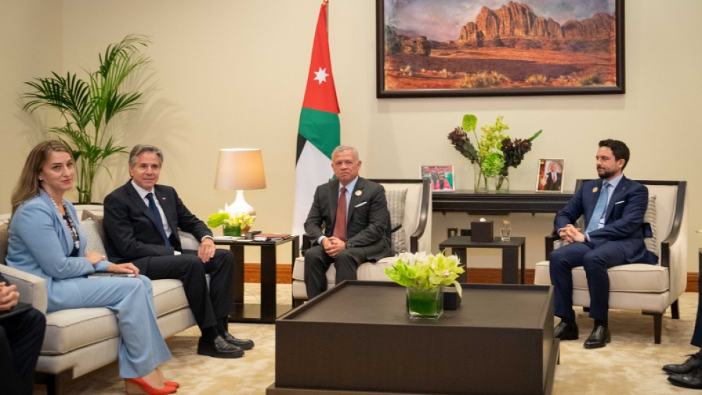 التقى جلالة الملك عبدالله الثاني، وزير الخارجية الأمريكي أنتوني بلينكن، الثلاثاء،على هامش المؤتمر الدولي للاستجابة الإنسانية الطارئة في غزة.
