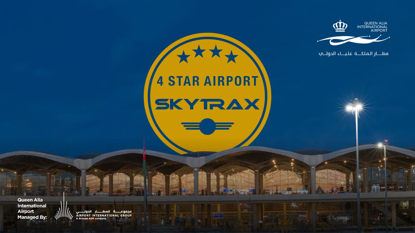 أعلنت "مجموعة المطار الدولي" أن مطار الملكة علياء الدولي حصل على تصنيف الأربع نجوم المرموق للمطارات، بعد مشاركته الأولى على الإطلاق في برنامج سكاي تراكس لتقييم المطارات العالمية.
