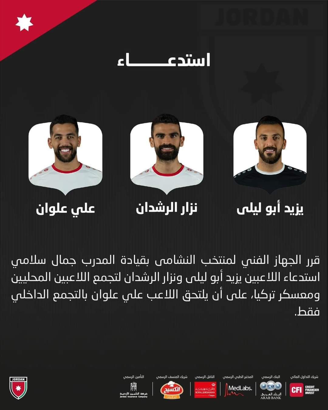 واستدعى سلامي اللاعبين يزيد أبو ليلى، نزار الرشدان وعلي علوان، لينضم الثلاثي للقائمة التي تشهد حضور 24 لاعبا آخرين هم نور بني عطية، عبدالله الفاخوري، أحمد جعيدي، إحسان حداد، فراس شلباية، يوسف أبو الجزر، حسام أبو ذهب، مهند أبو طه، سالم العجالين، عبدالله نصيب، سعد الروسان، براء مرعي، محمد أبو النادي، محمود شوكت، رجائي عايد، يوسف أبو جلبوش، وسيم الريالات، عارف الحاج، محمود مرضي، محمد أبو زريق "شرارة"، سيف درويش، محمد أبو رزق، أنس العوضات، وبكر كلبونة .