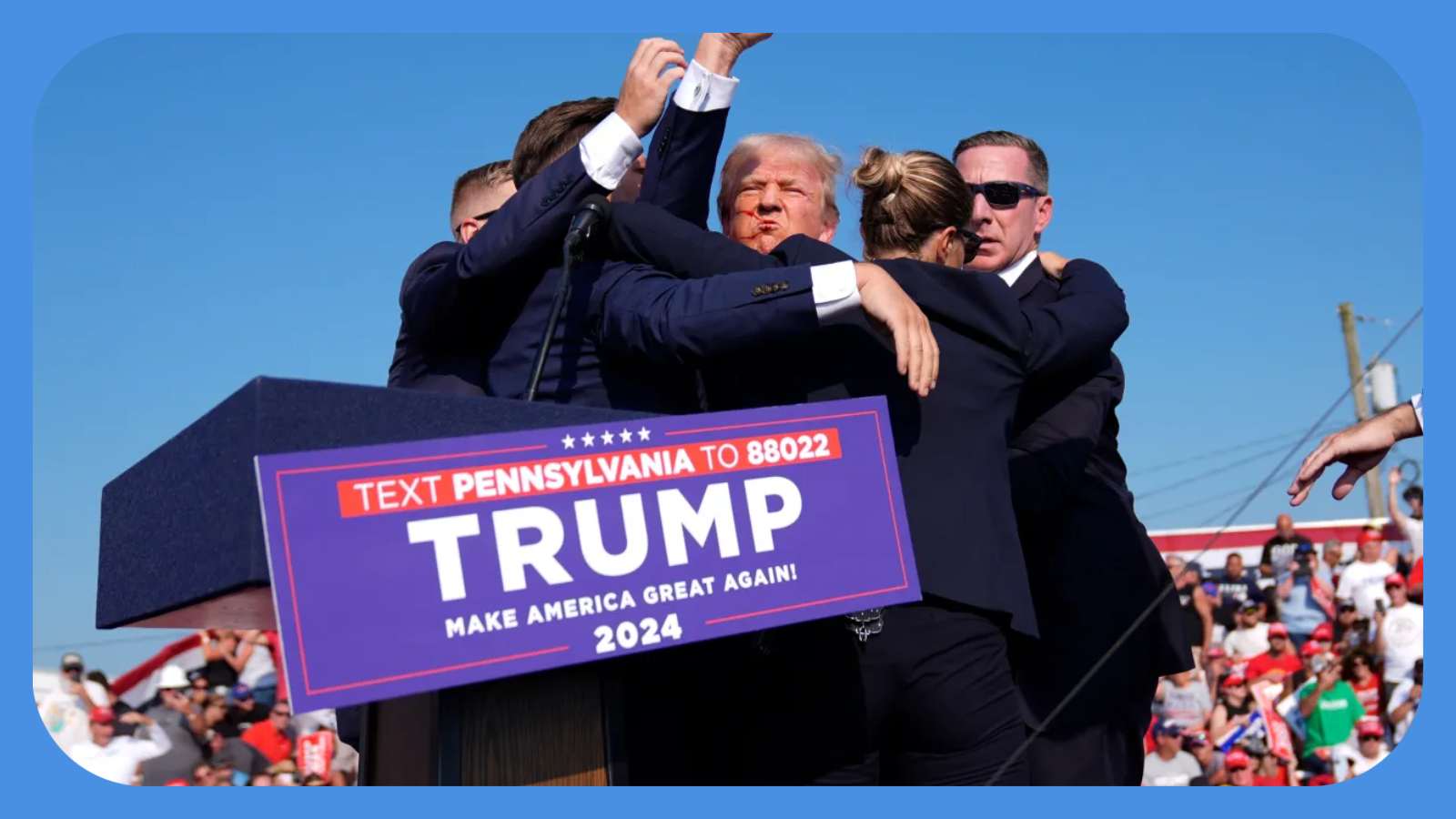 واصيب ترامب بجروح وظهرت الدماء على اذنه ووجه اثناء القائه كلمة في تجمع انتخابي امام مناصيريه في ولاية بنسلفانيا الاميركية السبت .