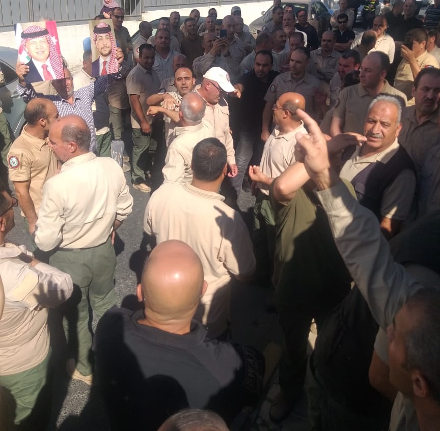 تظاهر موظفون من مختلف أنحاء المملكة يعملون في شركة أمن وحماية أمام مستشفى البشير في العاصمة عمان، احتجاجا على قرار صادر عن الشركة بتسريح الموظفين الذين تزيد خدمتهم على 5 سنوات.