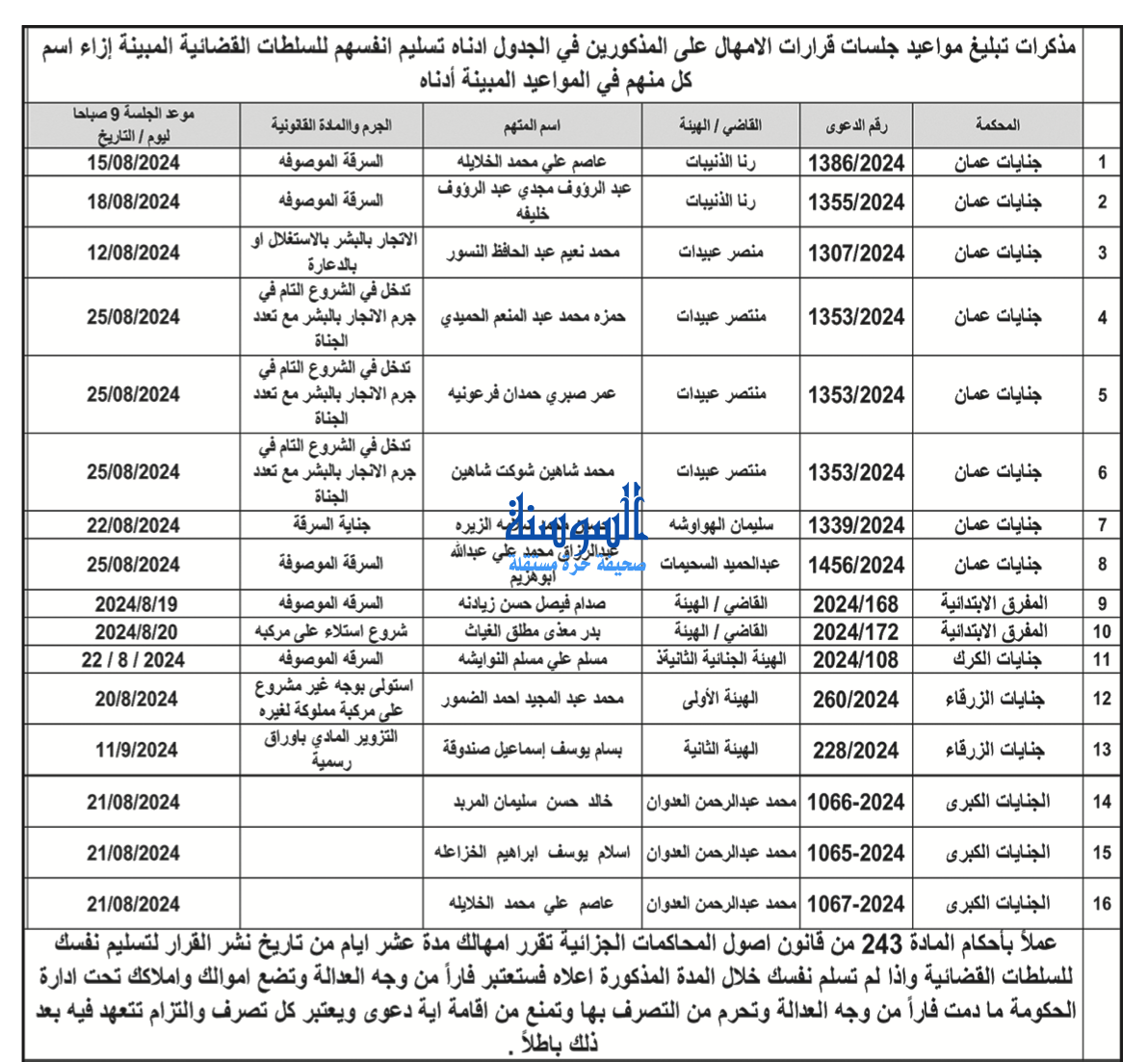 صدرت، الإثنين، مذكرات تبليغ بمواعيد جلسات قرارات الإمهال على المذكورين في الجدول أدناه، لتسليم أنفسهم للسلطات القضائية المبيّنة إزاء اسم كلٍ منهم في المواعيد المبينة أيضًا.
