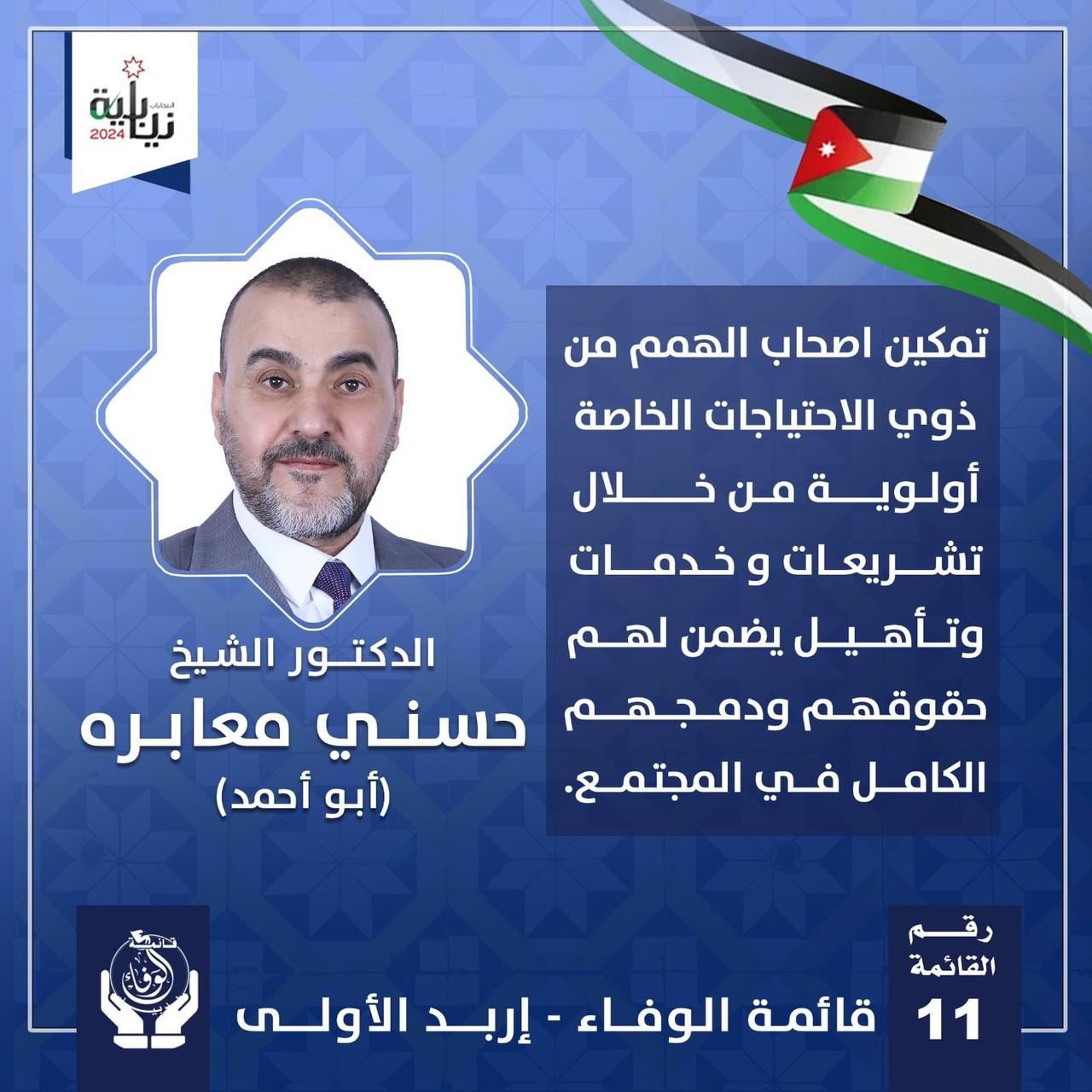 تشهد الانتخابات النيابية القادمة تنافس قوي بين مختلف ابناء محافظة اربد نظراً لاتساع نطاق الدوائر الانتخابية في ظل القانون الجديد، وبالرغم من أن القانون لم يكفل لفئة ذوي الاحتياجات الخاصة مقعد مستقل كغيرها من الفئات الأقل تمثيلاً (مثل مقعد المرأة والشباب)، إلا أن أحد المرشحين - وهو من ذوي الاحتياجات الخاصة - (الدكتور الشيخ حسني معابره) قد أخذ على عاتقه تمثيل هذه الفئة التي هو منها ويشعر بمعاناتها.