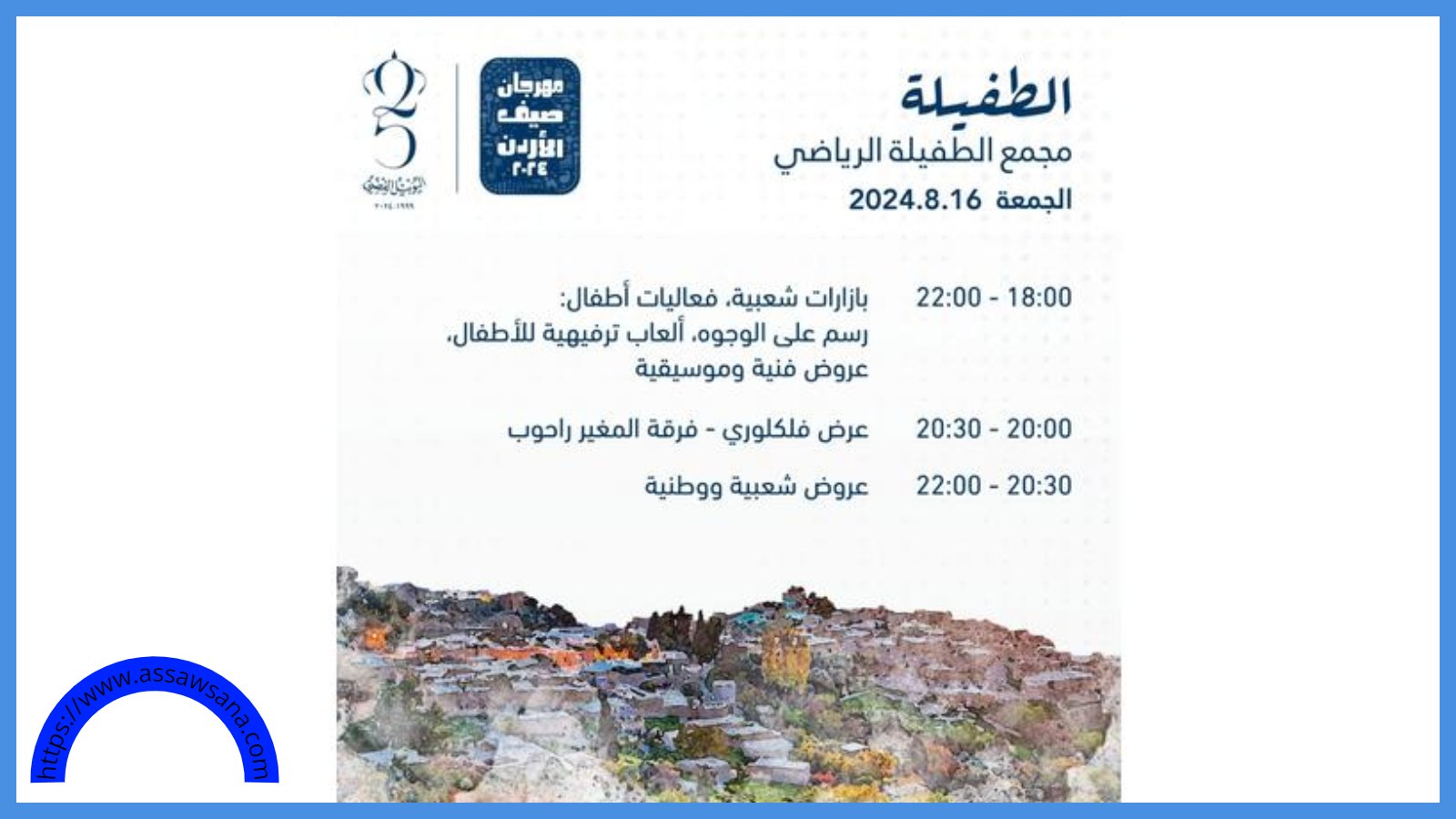 وتضمنت فعاليات الأسبوع الرابع من مهرجان صيف الأردن في الطفيلة، افتتاح بازار للحرف اليدوية والمأكولات الشعبية، وعرضا لعدد من الفرق الفنية للفلكلور والتراث الشعبي، ومسرحية للأطفال، إلى جانب فقرات غنائية، قدمها عدد من الفنانين المحليين، ومجموعة من الفقرات الخاصة بالأطفال.