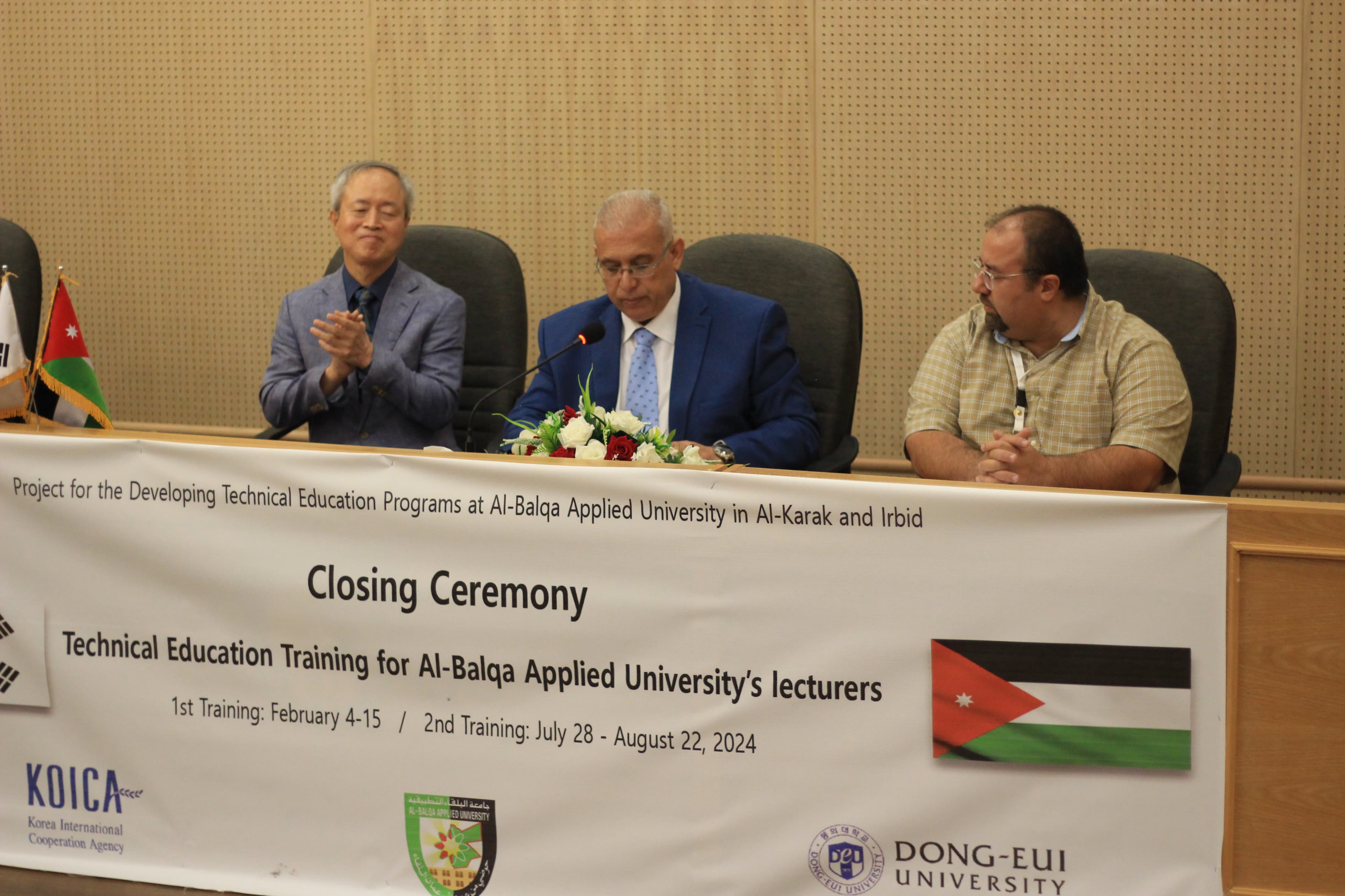 ونقل مندوب رئيس الجامعة عميد كلية اربد الجامعية خلال كلمته في حفل الختام، تحيات رئيس الجامعة الأستاذ الدكتور أحمد فخري العجلوني للمشاركين والقائمين على هذه الدورة والتي تهدف إلى تطوير برامج التعليم التقني ورفع كفاءة وقدرات الهيئات التدريسية وتزويدهم بالمهارات اللازمة لمواكبة التطور التكنولوجي ، مؤكداً على أن هذا الانجاز يأتي تجسيداً لرؤية الجامعة المستمدة من توجيهات جلالة الملك عبدالله الثاني حفظه الله وهي سياسة انتهجتها جامعة البلقاء التطبيقية في تشجيع وتطوير التعليم التقني والمهني، وتعزيز الشراكة مع المجتمع المحلي معبراً عن اعتزاز الجامعة والكلية بالعلاقات التي تربطهم بوكالة (KOICA) والجامعات والمعاهد الكورية.