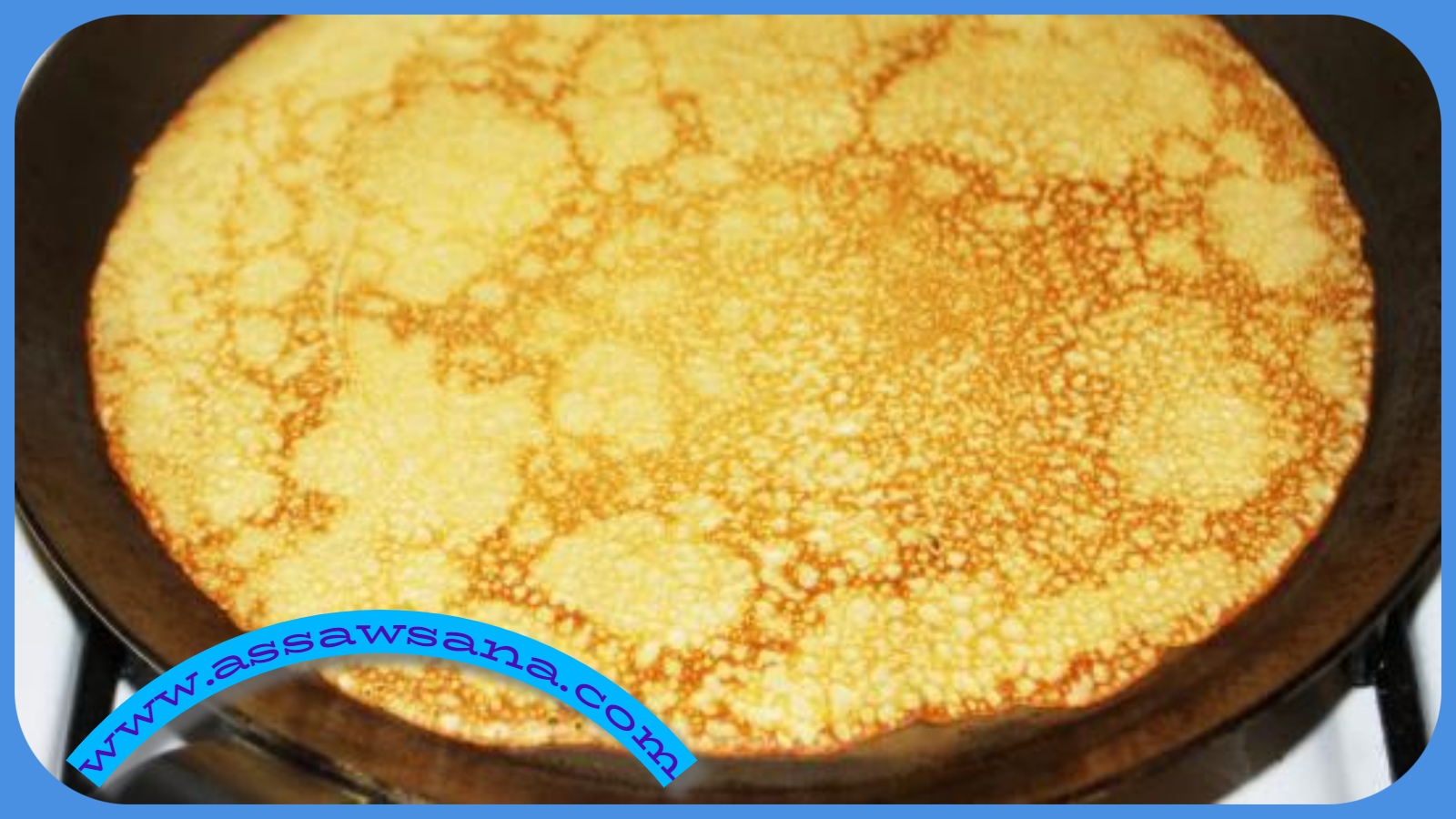 -وضع مقلاة متوسطة الحجم غير لاصقة على نار متوسطة ثمّ سكب مقدار من العجين في المقلاة الساخنة حسب الرغبة مع مراعاة تحريك المقلاة بشكل دائري حتى يتغلف قاع المقلاة بالكامل بالعجين وتصبح العجينة رقيقية.