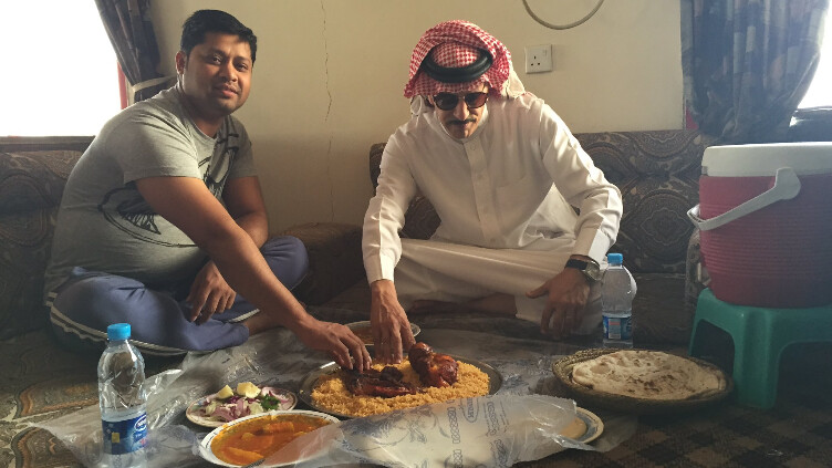 ضجت مواقع التواصل الاجتماعي، بصورة ادعى ناشروها أنها تُظهر مواطنًا سعوديًّا وهو يعامل وافدًا أجنبيًّا بود واحترام ويتناول معه الطعام بعد عرض فيلم حياة الماعز.