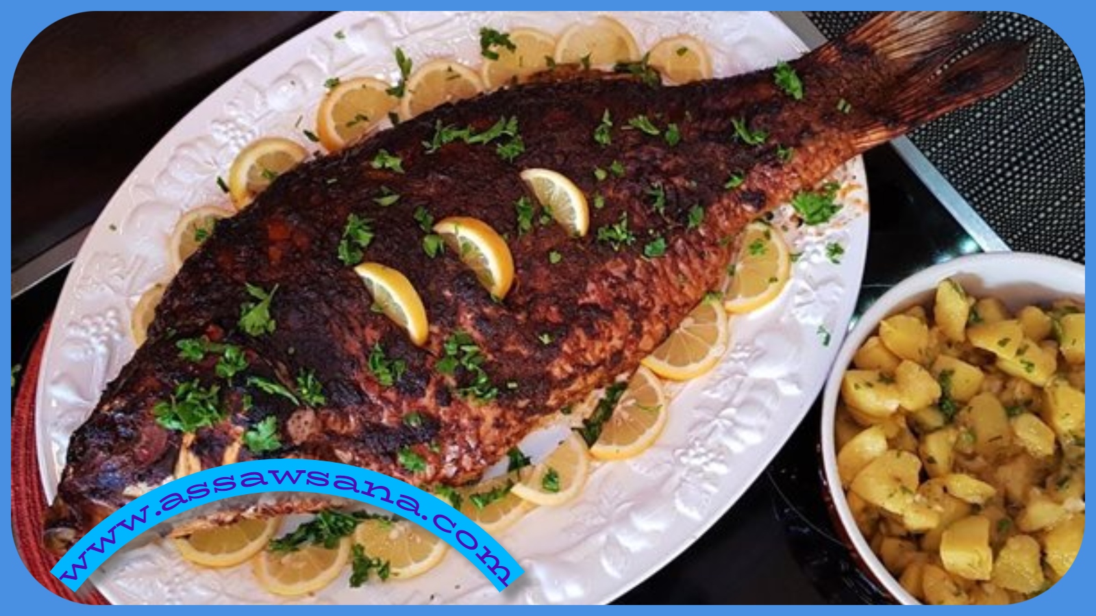 6. وضع خليط البطاطا في داخل السمكة لتملئيها ثمَّ وضع بقية البطاطا حول السمكة ثمَّ توزيع شرائح الليمون على السمكة ثمَّ تغليف السمكة بقطعة ثانية من ورق الألمنيوم ثمَّ سكب مقدار كوبين من الماء في الصينية حول السمكة ثمَّ توزيع عدة شرائح من الليمون لتعطي رائحة مشهية أثناء شوي السمكة.