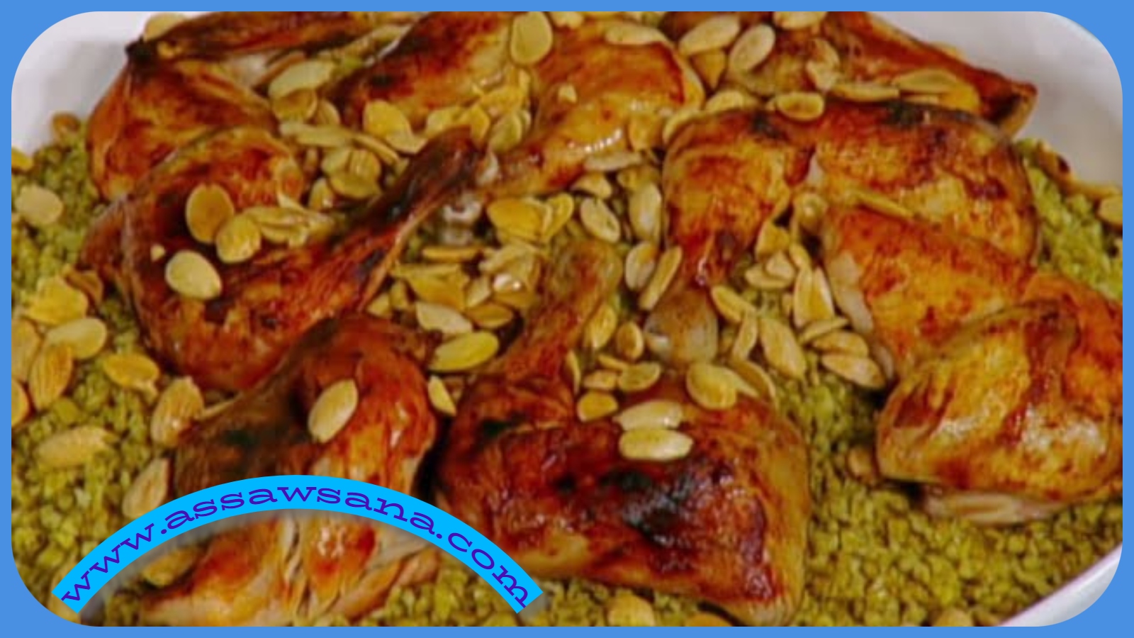 7. نضع الفريكة في طبق واسع، ونوزع اللحم على السطح، ثم نثر اللوز المقلي.