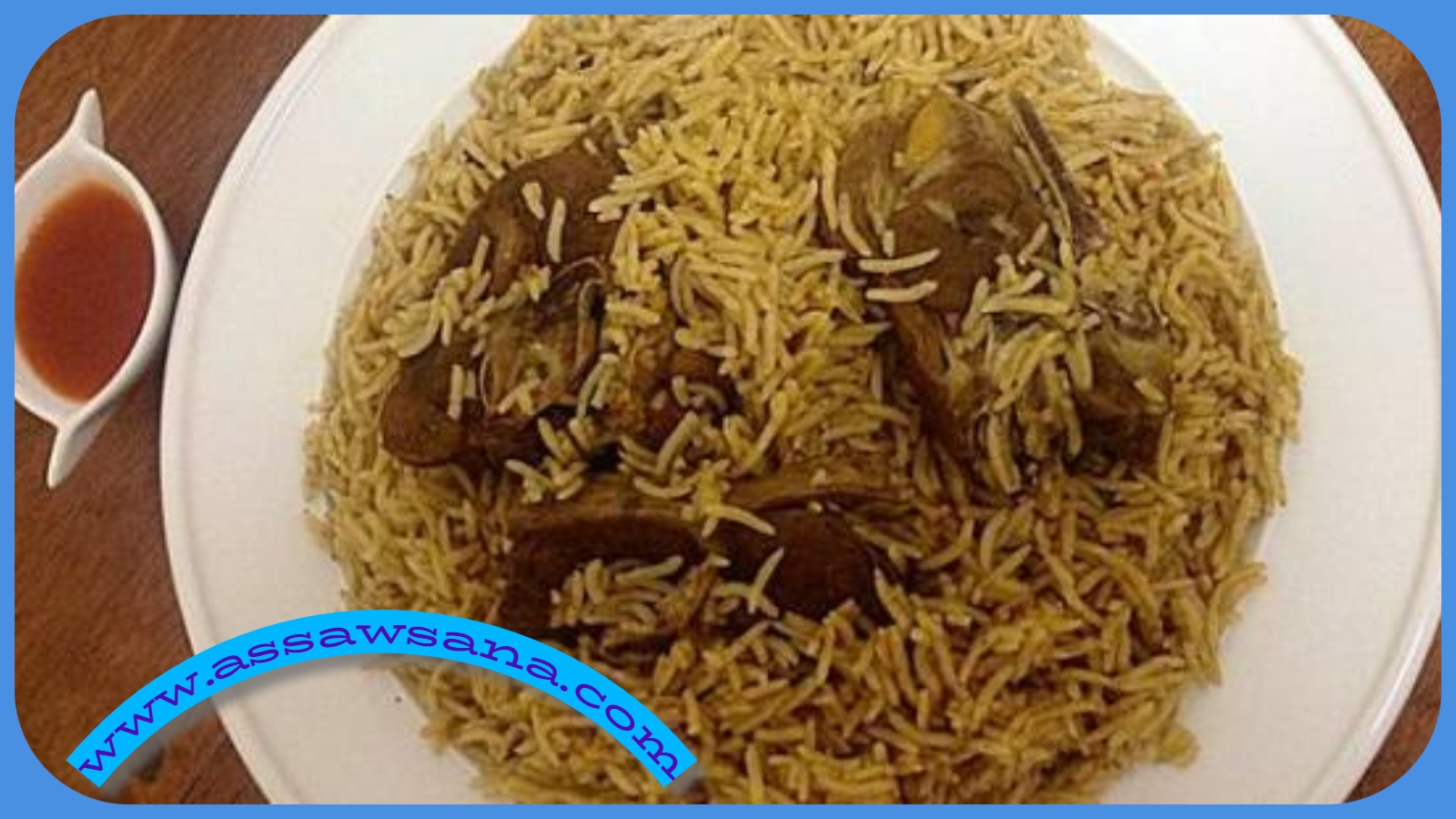 كيلوغرام من الأرز البسمتي. نصف كيلوغرام من لحم عجل مع العظم. بصلة مقطّعة إلى قطعٍ صغيرةٍ. ثماني حباتٍ من الطماطم متوسطة الحجم. أربع سنونٍ من الثوم المفروم ناعماً. ملعقةٌ صغيرةٌ من القرفة والهيل. ثلاث ملاعق كبيرة من صلصة الطماطم. ملعقتان كبيرتان من البهارات المشكلة. ملعقةٌ صغيرةٌ من الفلفل الأسود. ملعقةٌ صغيرةٌ من الزنجبيل المطحون. نصف كوبٍ من الزيت. ملح. ماء للطبخ.