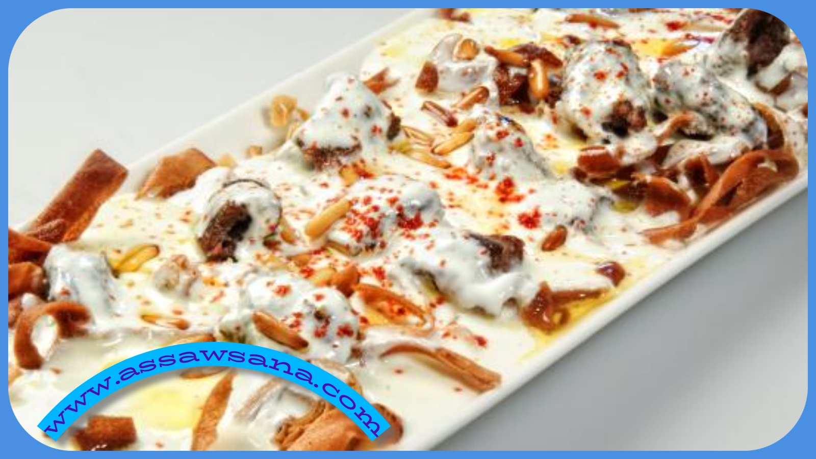 10. وضع الخبز المحمّص في طبق تقديم مناسب الحجم ثمّ صب خليط الكشك فوقه ووضع ما تبقى من البصل المقلي على وجه الفتة ثمّ تقديمها.